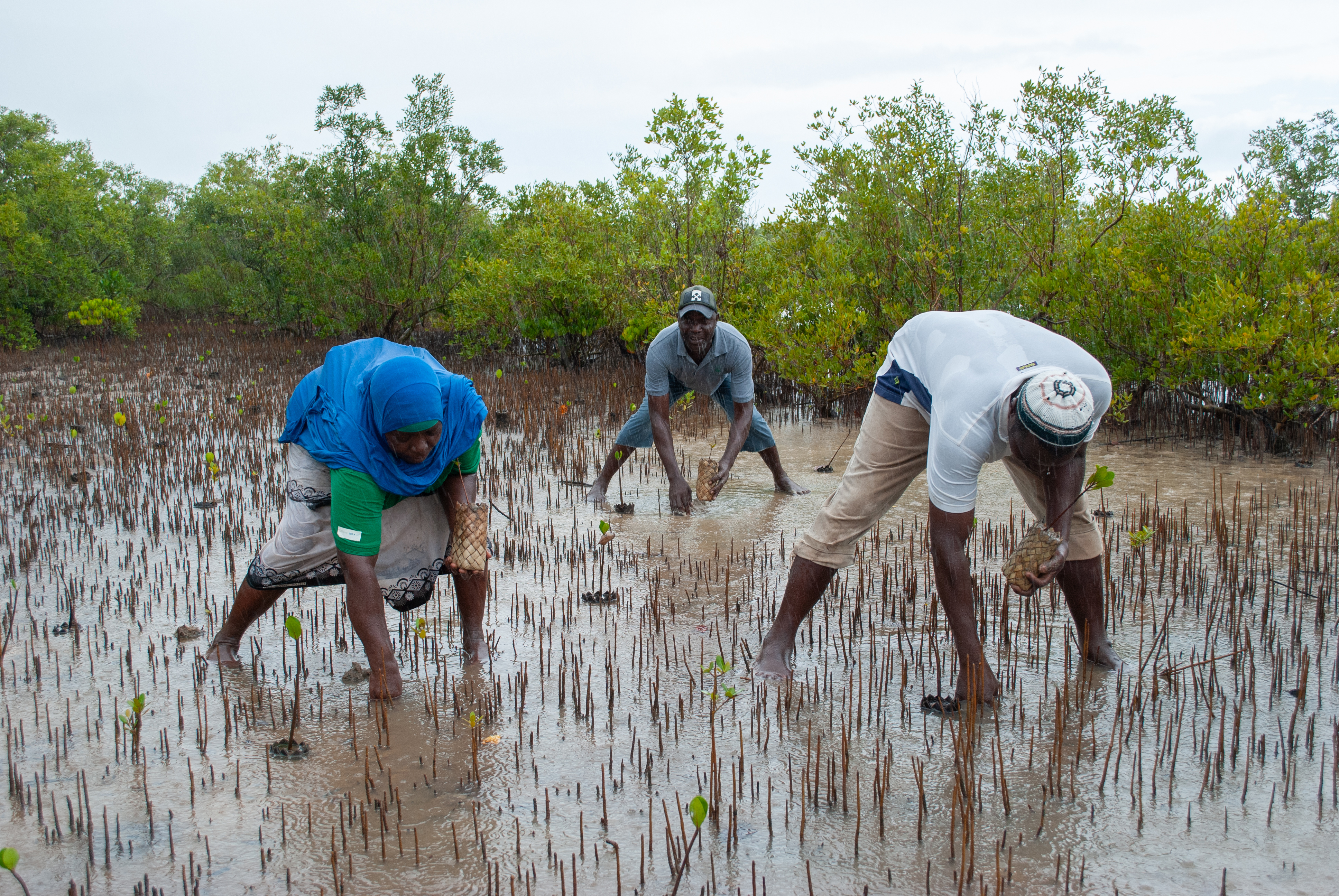 As the rain pours down, Muanema Timam digs a hole in the watery sand and plants another mangrove seedling. Her cobalt blue veil is drenched, but there is work to do.