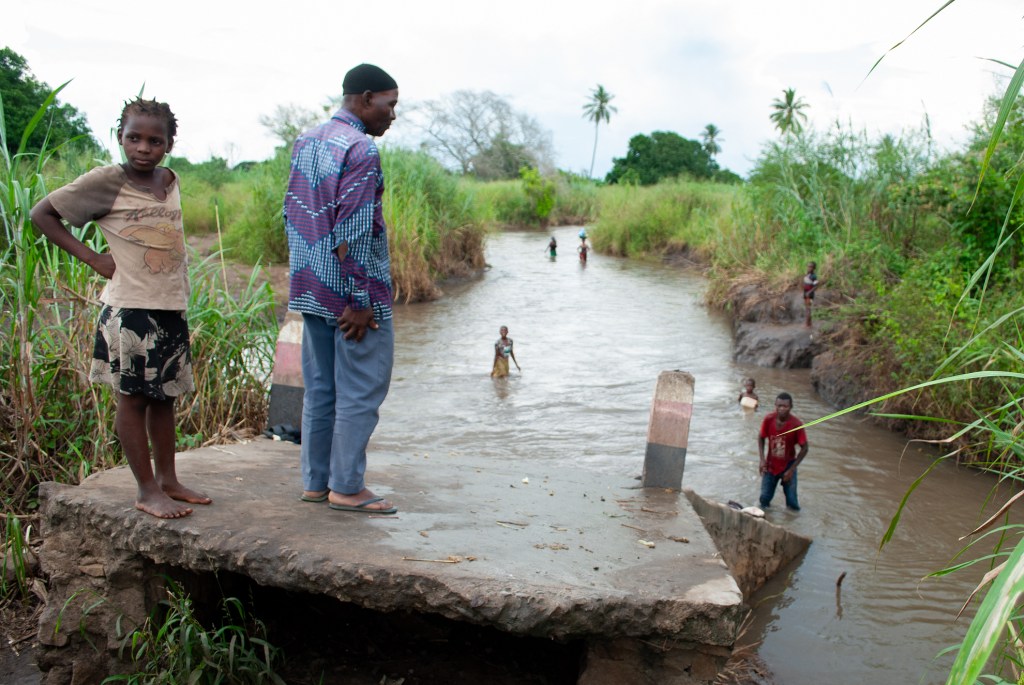 Community Bashiruna Bakar standing on a broken bridge near his village, 25 de