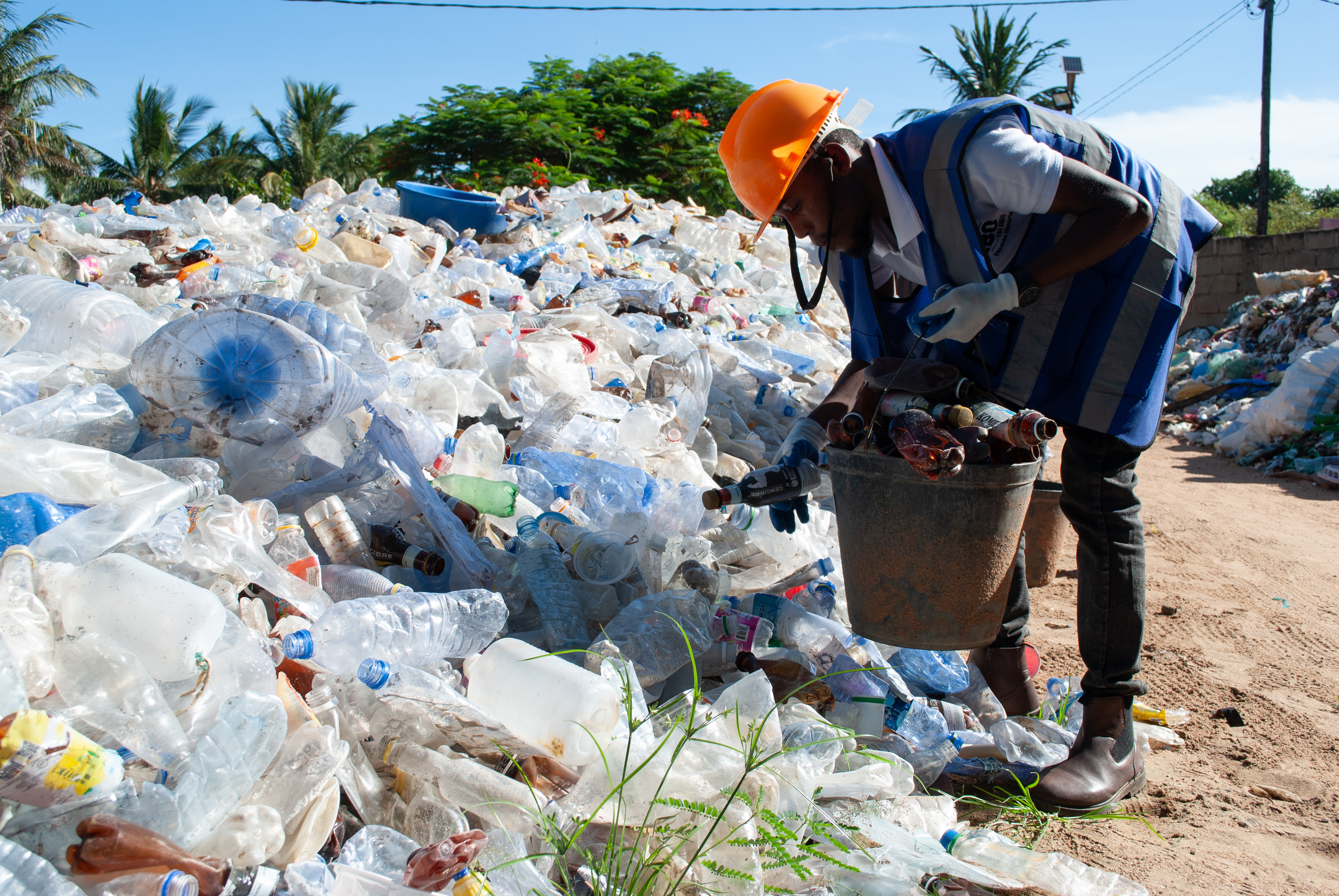 Marques Joao steps uneasily over the pile of plastic which extends like a glacier in front of his work building. Searching for little brown bottles, he picks them out, fills his bucket, then descends the morass. Joao works for ASMOG, an NGO operating in Cabo Delgado province, northern Mozambique, whose mission is to gather plastic waste and sell it to recycling companies.