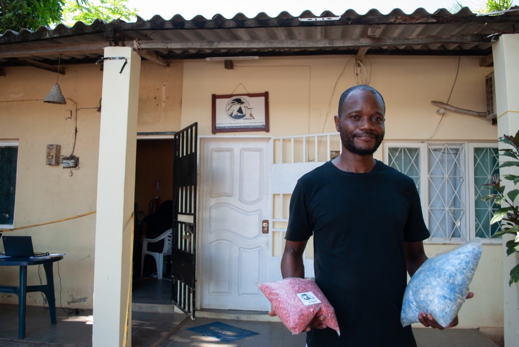 ASMOG coordinator for Pemba, Eugidio Gobo, holding packs of processed plastic in front of the ASMOG office, Pemba. ASMOG collects around 10 tonnes of rubbish in Pemba each month.